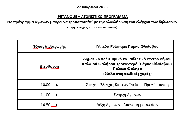 Τόπος διεξαγωγής: Γήπεδα Petanque Πάρκο Φλοίσβου, Δημοτικό Πολιτισμικό και Αθλητικό Κέντρο Δήμου Παλαιού Φαλήρου Τροκαντερό